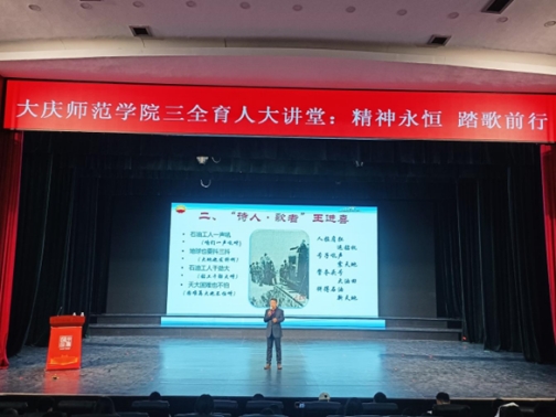 王永桦教授以“大庆精神铁人精神的孕育与传承”为主线,通过激情燃烧大荒原、“诗人·歌者”王进喜、时代之歌:我为祖国献石油、铁人颂歌代代传四个篇章,为学子们铺展了一幅中国石油工业的奋斗长卷。