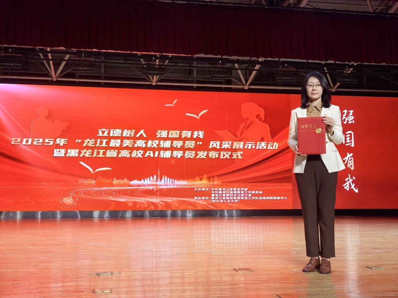 3月27日下午,由中共黑龙江省委宣传部、中共黑龙江省委教育工委、黑龙江省教科文卫体工会委员会联合主办的“立德树人强国有我”龙江最美高校辅导员风采展示活动暨黑龙江省高校AI辅导员发布仪式在哈尔滨工业大学举行。省委宣传部、省教育厅等领导出席活动并颁奖。经学校推荐、资格审核、通讯评审、述职答辩等环节,我校辅导员孙琦获得第十七届“黑龙江省高校辅导员年度人物”荣誉称号。学校党委副书记、工会主席刘迪应邀出席本次活动并作为往届龙江高校辅导员年度人物代表领誓重温《高校辅导员誓词》。